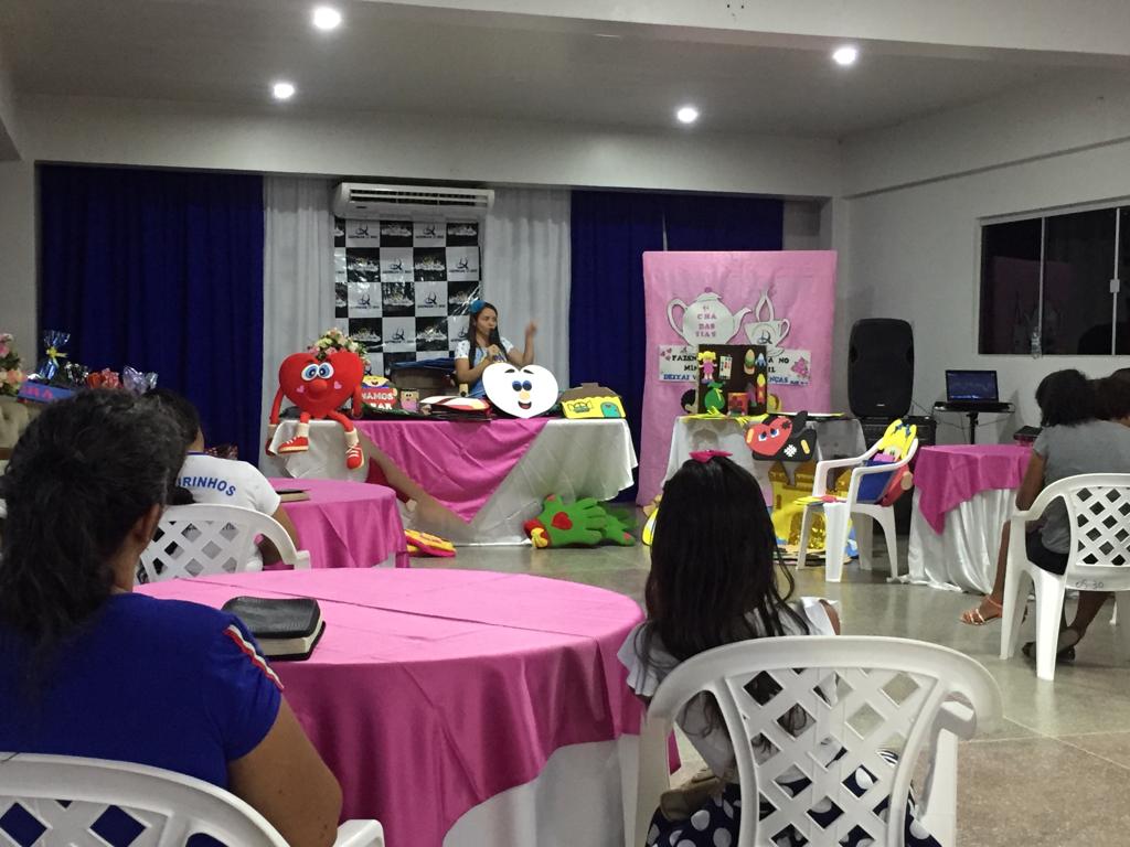 A palestrante convidada foi a irmã Cris Nunes, que veio da cidade de Ariquemes com a missão de compartilhar com as irmãs sua experiência nesse ministério. Irmã Cris apresentou algumas dinâmicas para tornar o trabalho prazerosos e cativar a atenção das crianças com a ministração da Palavra de Deus. Corinhos com expressão corporal, histórias bíblicas representadas com material concreto, dinâmicas de grupos, dramatizações, recursos audiovisuais são alguns métodos que devemos exercitar no trabalho com as crianças na igreja. As irmãs que participaram do Chá também tiveram acesso a um vasto material visual exposto por Cris Nunes e receberam orientações em suas confecções e utilização nas classes.